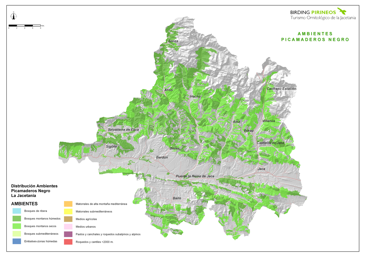 COSTUMBRES: Se posa en los troncos y en las ramas más gruesas y excava un agujero de entrada al nido de unos 9 x 12 cm. Tamborilea frecuentemente, especialmente en la primavera para marcar su territorio. Vive en zonas templadas y frías de Europa. En el Pirineo encuentra su límite sur. En la Jacetania es un ave sedentaria que habita en los bosques viejos hasta unos 1.800 m de altitud. San Juan de la Peña cuenta con varias parejas y una densidad más alta que el resto del Pirineo. Nidifica en oquedades de árboles maduros a considerable altura. El hueco lo hacen tanto el macho como la hembra. Los pollos en un mes abandonan el nido.